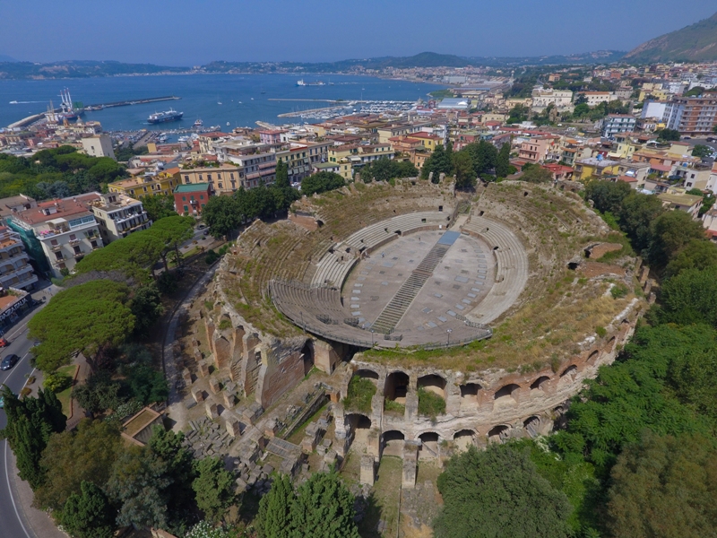 Visiteremo il terzo Anfiteatro più grande d’Italia dopo il Colosseo e quello di Capua. In tutto l’Impero solo due città avevano due anfiteatri Roma e Pozzuoli e questo ci fa ben capire l’importanza di Puteoli nell’antichità. Daremo uno sguardo alla più antica arena di Pozzuoli che risale alla fine del II sec. a.C. e ne sono visibili oggi pochi resti. Entreremo e visiteremo l’Anfiteatro detto Maggiore o Flavio che fu costruito dagli stessi architetti del Colosseo di Roma e fu terminato sotto la dinastia della gens Flavia dall’Imperatore Vespasiano. Si pensa che i lavori di questo anfiteatro siano stati iniziati da Nerone che fino alla sua morte avvenuta nel 68 d.C. soggiornava spesso a Pozzuoli e che qui ha realizzato tanti progetti tra cui il canale navigabile tra Pozzuoli e Roma.